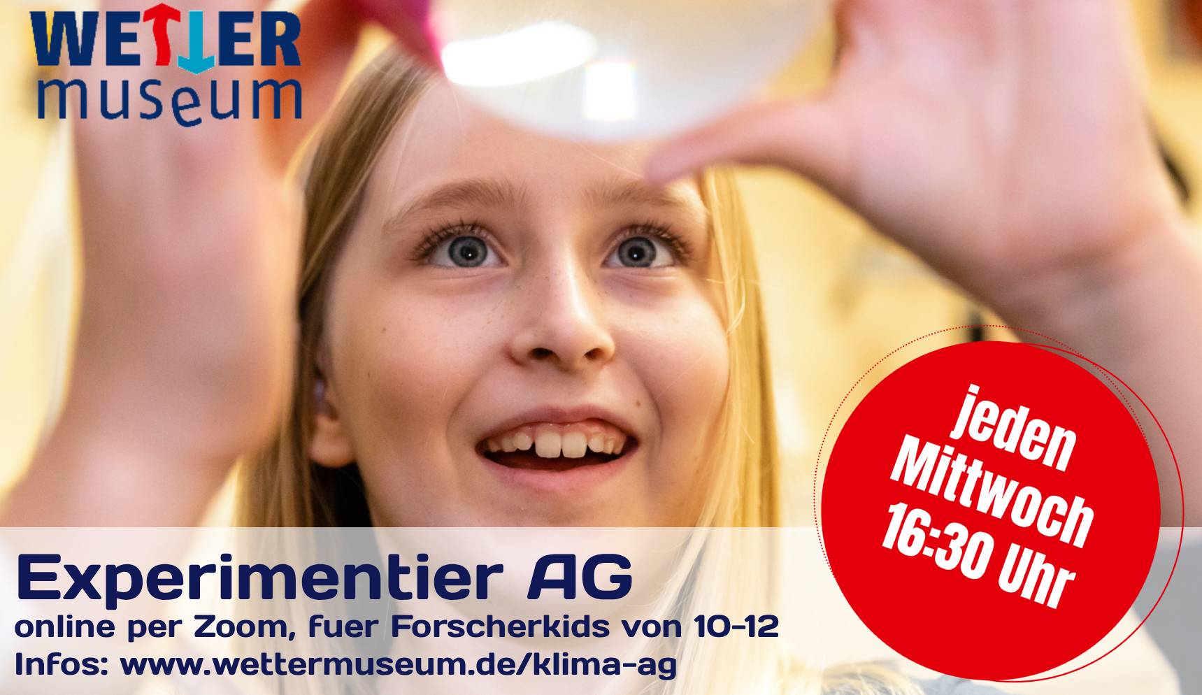 Im hoffentlich goldenen Herbst veranstalten wir in der Ferienzeit vom 06. bis 29. Oktober 2025 wieder ein spannendes Familienprogramm rund um Wetter und Klima. Immer Montags bis Donnerstags von 10:00 bis 14:00 Uhr entführen wir euch mit einer brandneuen Experimentiershow in die Geheimnisse der Physik von Wolken, Wind und Wetter. Zusätzlich gibt es täglich eine Familienführung für Jung und Alt und ein Bastelangebot für Kids.